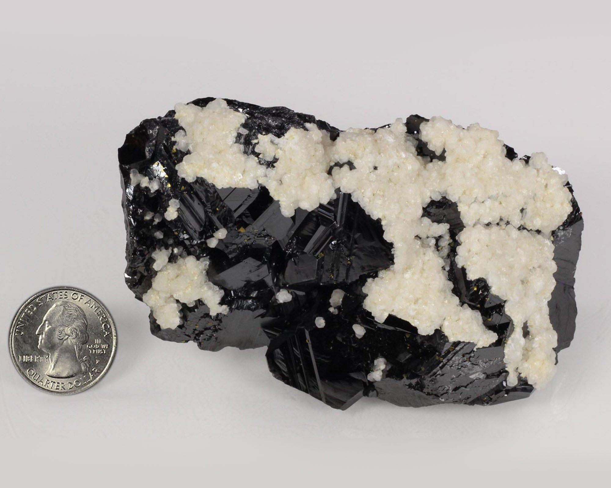 A large, aesthetic specimen of lustrous, brilliant-black twinned Sphalerite crystals with partial overgrowth of translucent, off-white druzy Calcite crystals. The Sphalerite crystals are well-formed and sharp with a brilliant metallic luster. A beautiful piece in excellent condition.