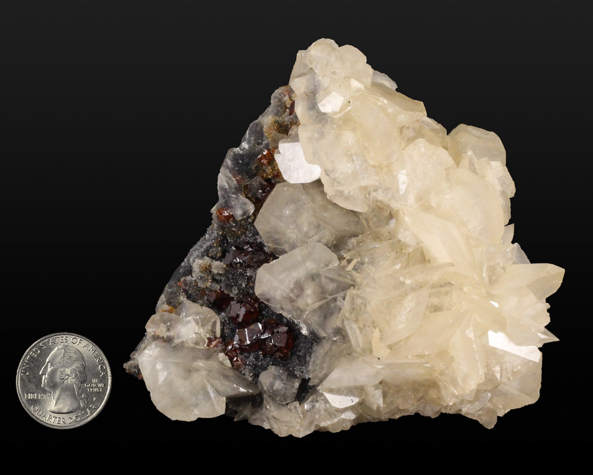 “Jack” is the nickname or slang term miners used to refer to Sphalerite. Black Sphalerite was called Black Jack and the translucent ruby-red from of Sphalerite was aptly called Ruby Jack. Thus, we have a very aesthetic piece consisting of dark-gray Chalcedony hosting numerous Ruby Jack Sphalerite crystals and even more numerous intersecting lightly golden-colored lenticular Calcite crystals. Exceptional piece with great luster, crystal formation and contrast - in excellent condition.
