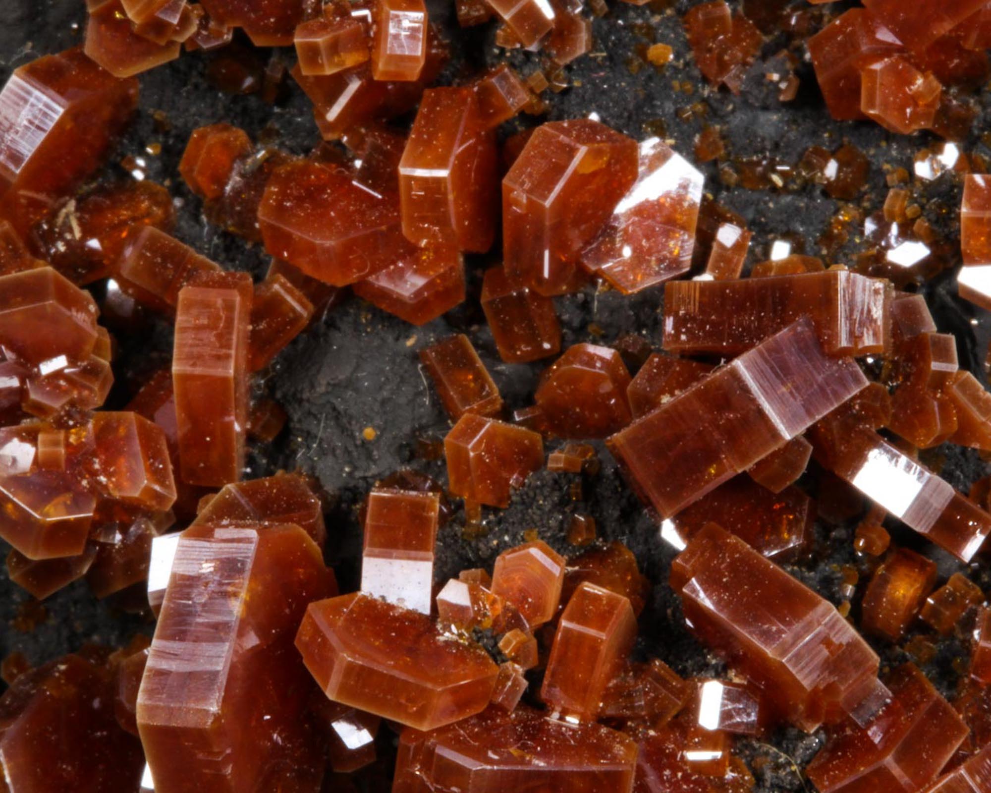 A cabinet-sized specimen of deep-red Vanadinite crystals on black Goethite matrix. The crystals are sharp, lustrous and translucent and contrast nicely with the dark Goethite matrix. Very aesthetic piece in excellent condition.