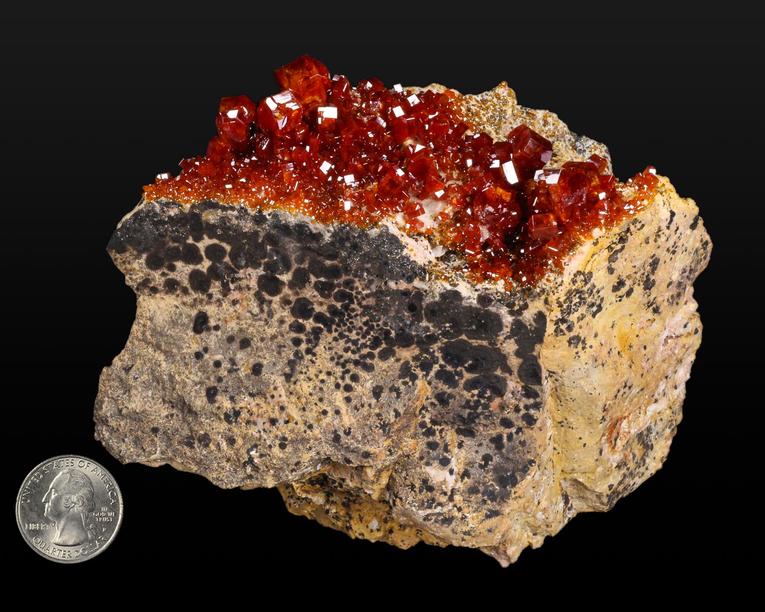 A large specimen featuring a dense covering of bright red, translucent and gemmy Vanadinite crystals on a light-colored, contrasting matrix. Great color, contrast and luster - in excellent condition.