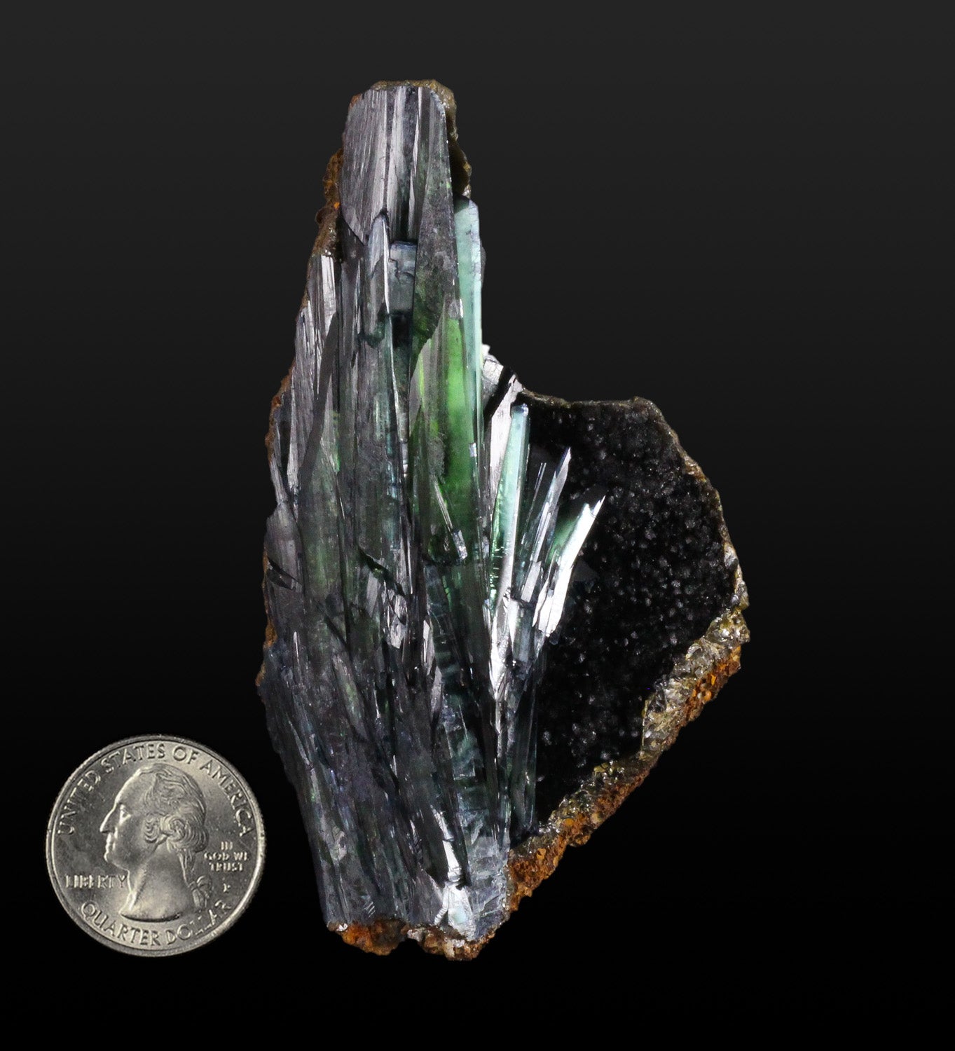 A lustrous, fan-shaped cluster of elongated, translucent, dark-green Vivianite crystals on matrix coated with contrasting velvety-black Goethite. An exceptional specimen with pristine crystals, great color and contrast. Very aesthetic with no damage.