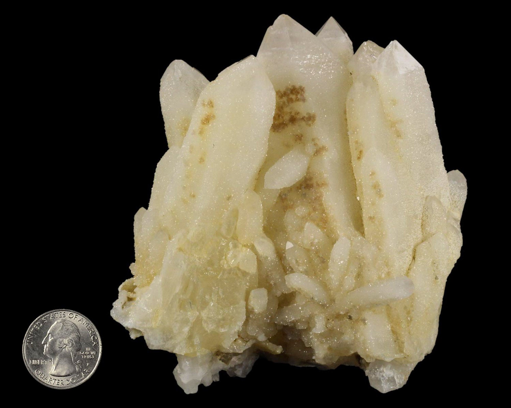 An impressive, light yellow Quartz cluster from Madagascar. There are over half a dozen crystal terminations, and numerous more smaller terminations near the bottom of the specimen. The front of the piece is dusted with a druze of microcrystalline Quartz, creating a beautiful sparkly luster. I know Quartz specimens are a “dime a dozen” but this piece is particularly attractive with uncommon yellow color (natural), great luster and all of the terminations, large and small, pristine. I have seen similar specimens referred to as “Candle Quartz,” “Pineapple Quartz,” and “Cathedral Quartz” to name a few. But to keep it simple, I’ll simply refer to it as Yellow Quartz.